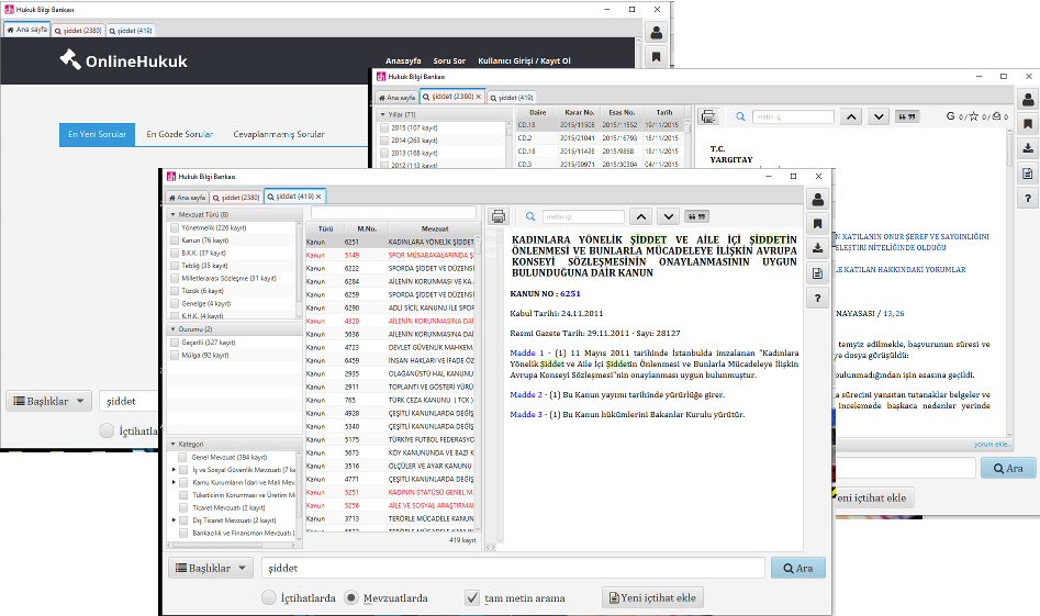 Yeni yazılımımızda kullanıcılarımızın faydalanması için bulundurulan karar sayısı arttırılmış, içerik zenginleştirilmiştir. Kelime köküne göre arama (örn: belgelerde ibaresi yazıldığında "belge" kelimesi aranmakta olup sonuç sadece "belgelerin" olarak değil "belge, belgede, belgeleri, ....) gibi kök kelimeye göre arama yapmaktadır. Sadeleştirilmiş arama (tek arama bölümü içerisinde tüm aramaları gerçekleştirme.) Sekmeli bağımsız arama sonuçları. Karar ekleme İçtihatlara yorum ekleme, Hukuk soru / cevap bilgi paylaşım portalı Kullanımı kolay sadeleştirilmiş tamamen yenilenmiş yazılım Platform Bağımsız – Windows, Linux, Mac-Os kurulumları mümkün ... ve daha birçok özellik.. ** Yazılımlar kurulduktan sonra içerik yüklenmeye devam edilecek, yeni bölümler, yeni özellikler kullanıcıların bilgisayarına online güncelleme ile yüklenmeye devam edilecektir.