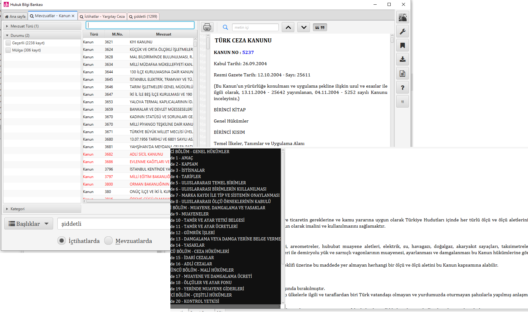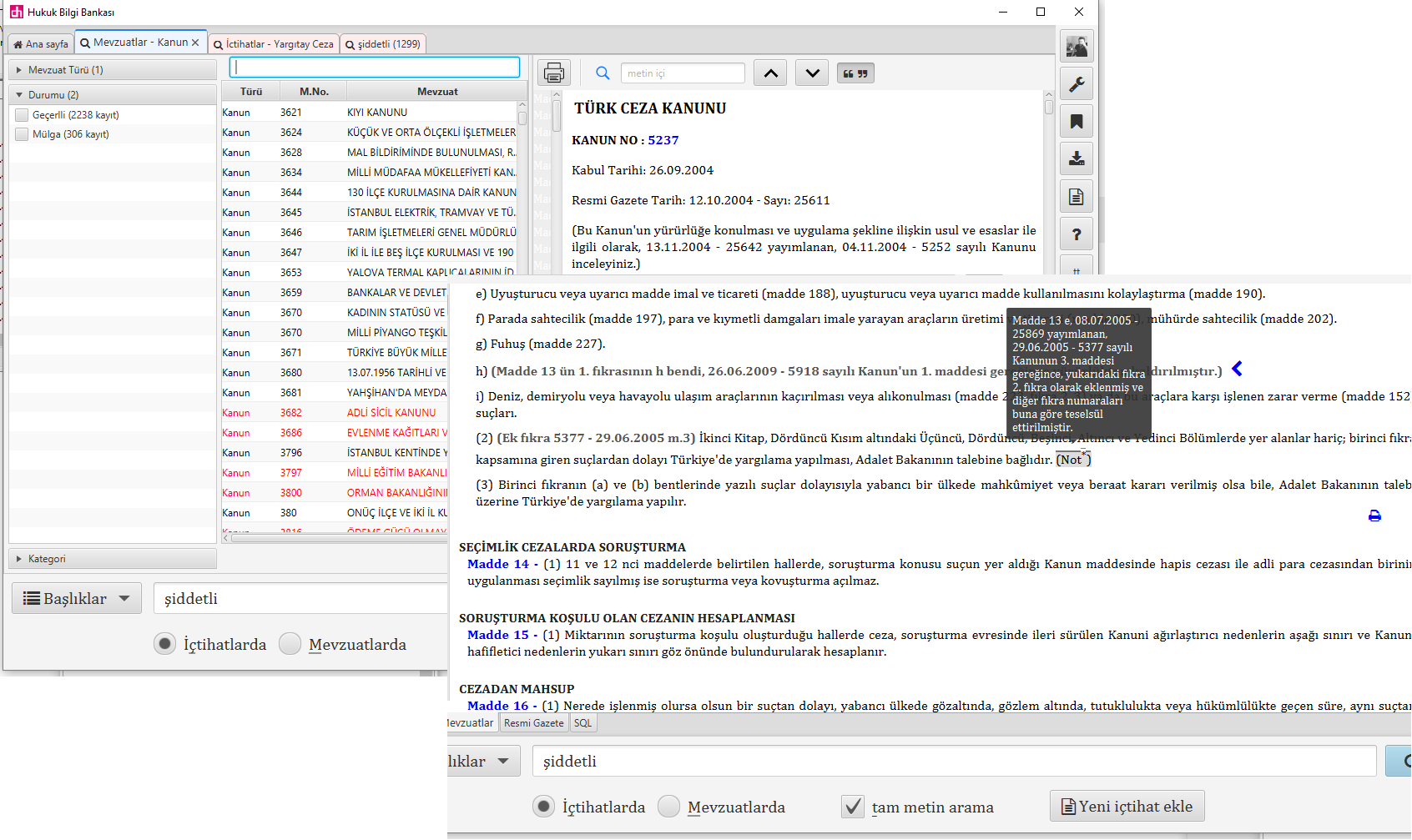 Ayrıca Kanun maddelerinden kararlara, kararlardan ilgili kanun maddeye ulaşmanızı sağlayan çapraz arama mevcuttur.